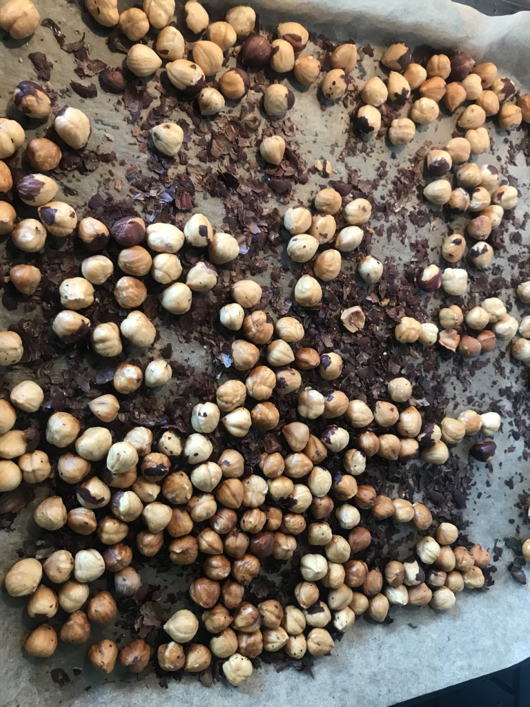 - Rist hasselnøttene i ovnen på 175 grader i 10-15 minutter. Pass på at de ikke blir brent.