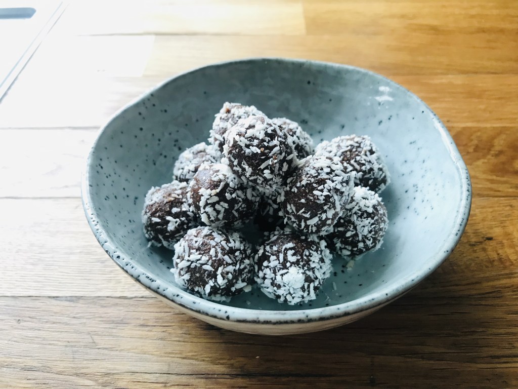 - Hvis du vil lage sjokoladekuler triller du små kuler og ruller dem i revet kokos. Disse oppbevares i fryseren og kan spises frosne 🙂